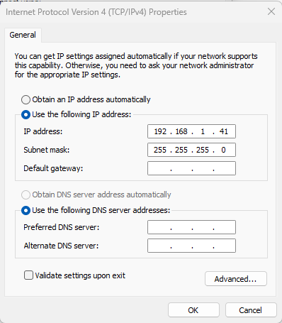 7. Marcar "Use the following IP address" para configurar IP manual y rellenar como se muestra en la imagen: