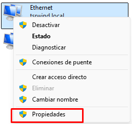5. En el Ethernet nuevo que se ha creado al conectar el adaptador hacer click derecho y pinchar en "Propiedades" (Si no sabes cuál Ethernet es, puedes desconectar el adaptador del ordenador y volverlo a conectar para ver cuál es el nuevo que aparece).